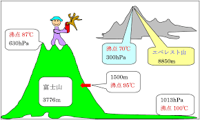 山での水が沸騰する温度の比較。エレベスト山頂 約70℃、富士山山頂 約87℃である。
