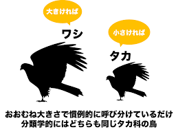 鷲と鷹は、どちらもタカ目タカ科の鳥で、違いは大きさです。