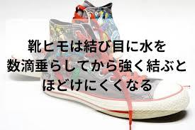 靴ひもを結ぶ時、結び目に数滴水をたらしてから強く結んでおくと、ほどけにくくなります。