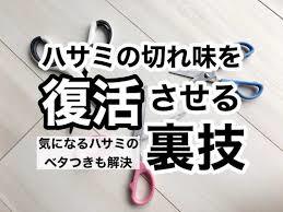 ハサミの切れ味が悪くなってしまった時、刃の粘着物や汚れを消しゴムでこすり取ります。