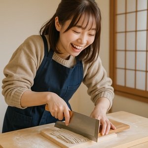 蕎麦職人のおじいちゃん先生に教わりながら、こねて、伸ばして、切って…