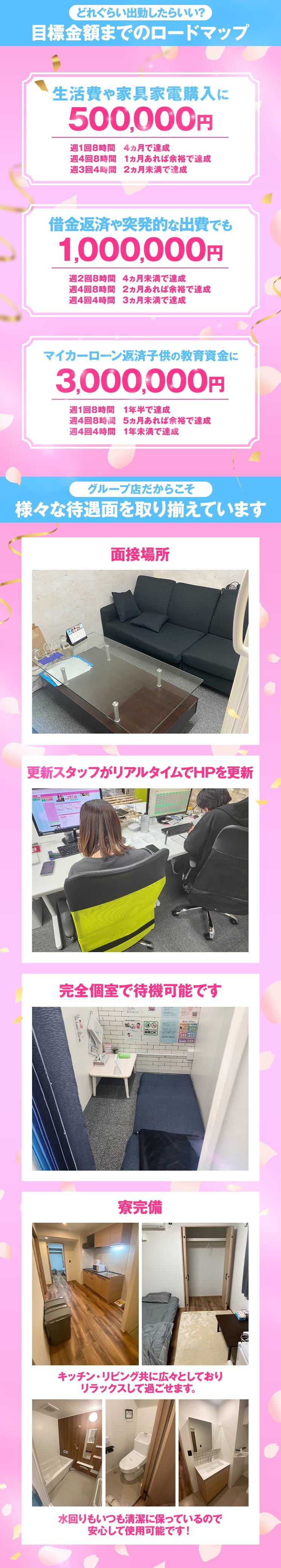| A | 寮は事務所が一階にありまして、2階に寮を準備しています!! 他にも、徒歩5分の場所にマンションを準備しています!! 県外から出稼ぎのキャスト様には交通費の支給などもしています!! |