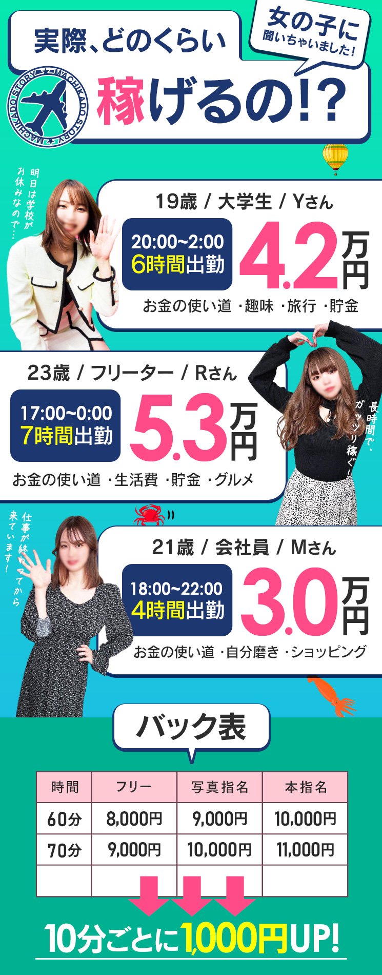 | A | 60分コースでフリー(ご指名なし)で8,000円、写真指名9,000円、本指名10,000円です。 さらにオプションは全額バックです。 完全日払い制です。 |
