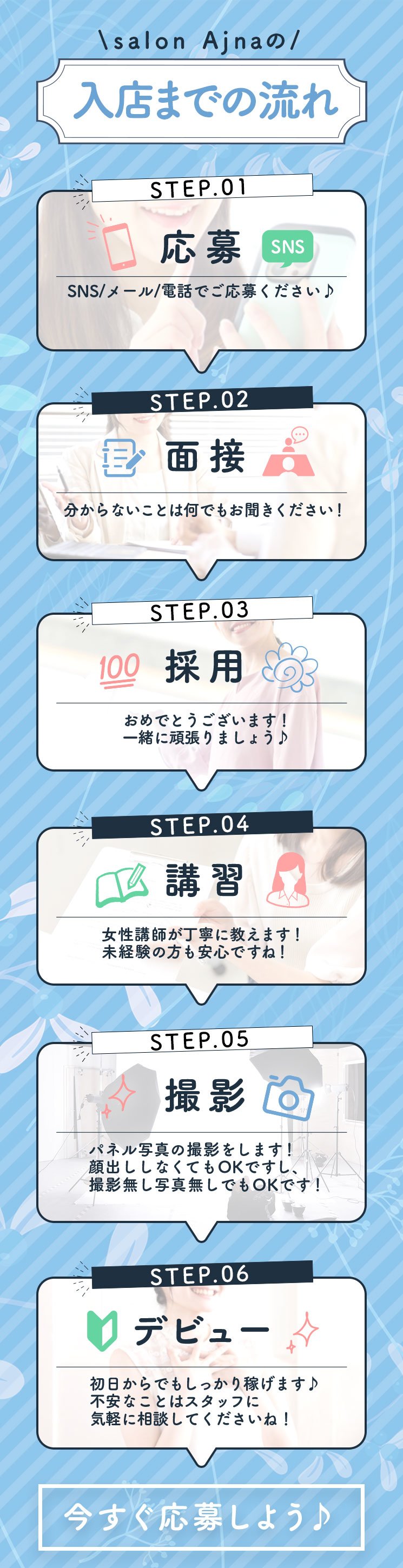 エステ店や風俗店など、全くの未経験の方!!ご安心ください!!在籍中の女の子も、ほとんどの子が未経験からのスタートです★
