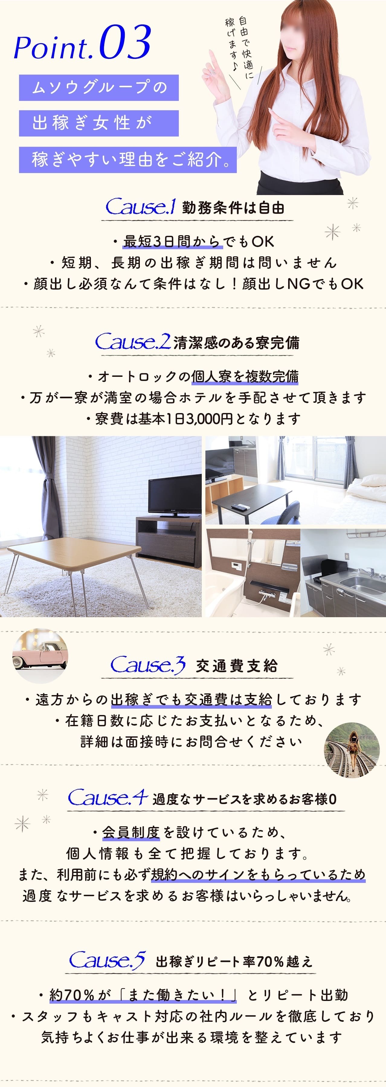 他の在籍のキャストさんに誰にも会わずにお仕事ができる為、お仕事に集中していただけるのと、キャストさん同士のトラブルは一切ございません。