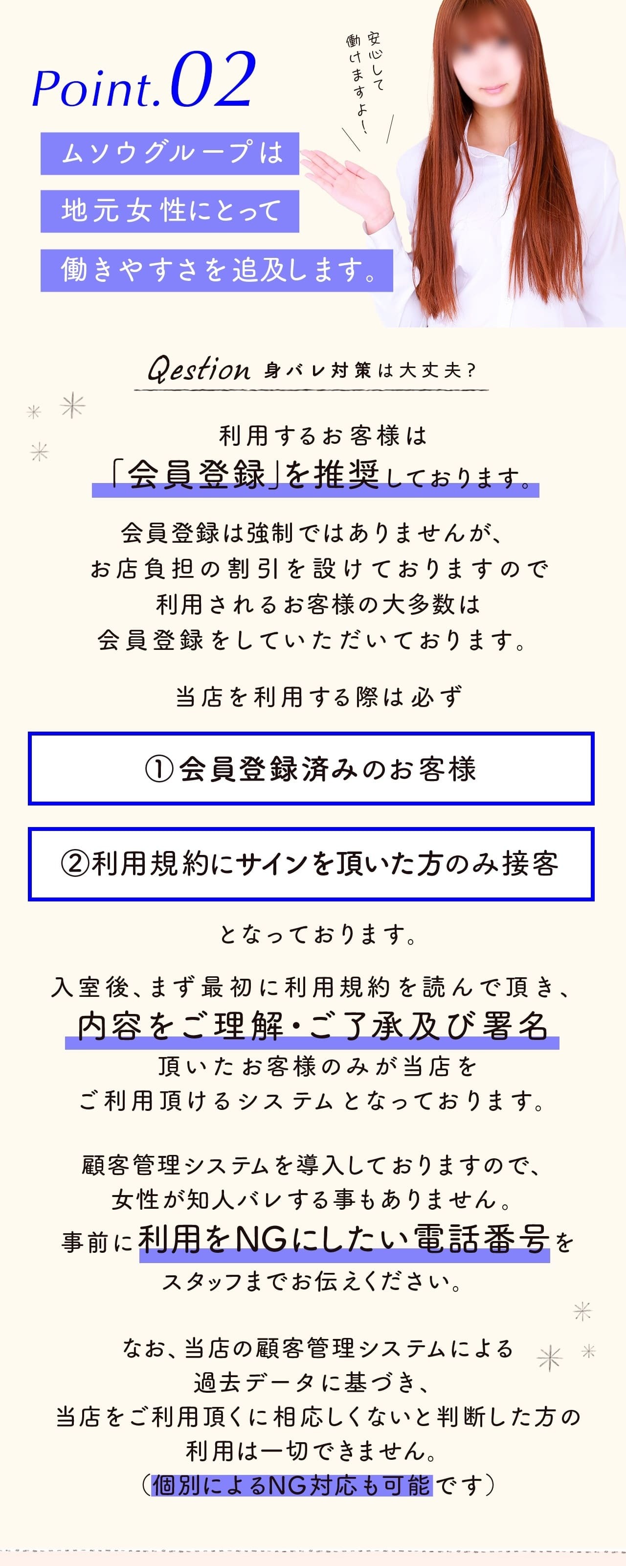 ☆徹底した顧客管理(身分証提示の会員システムの為、身バレの心配は軽減できます)☆