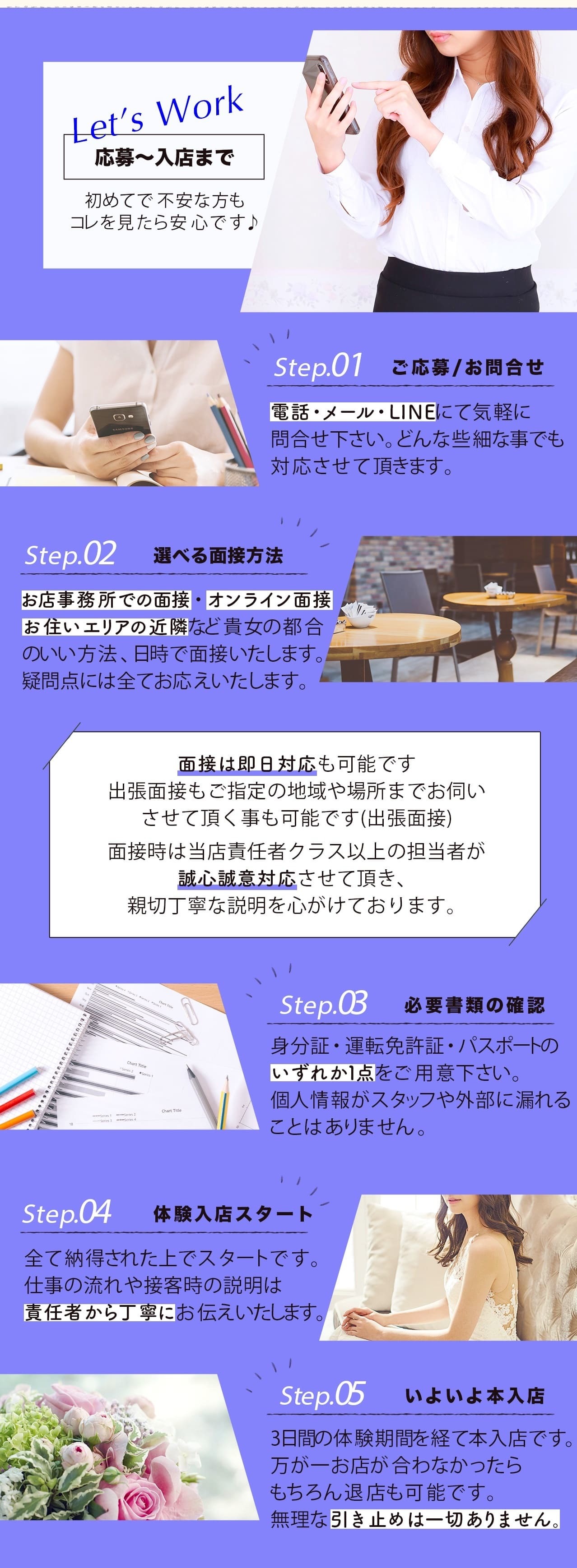 問い合わせ時、面接時、体験入店後の無理な引き止めなどは一切いたしません。安心して働けるように全力でサポート致しますので是非お気軽にお問い合わせください(*^。^*)