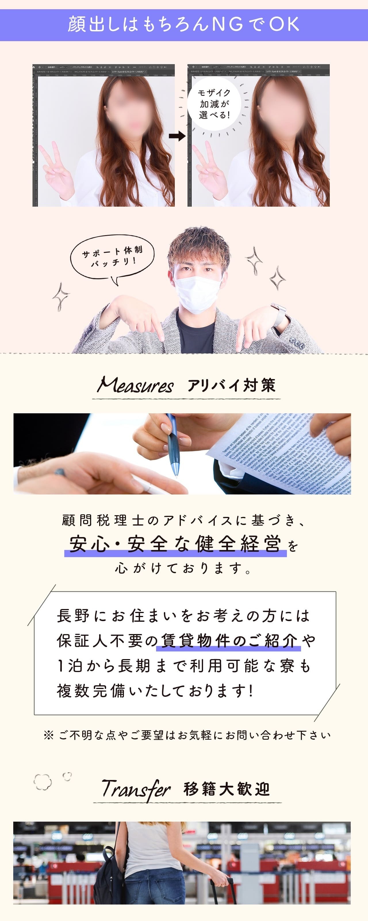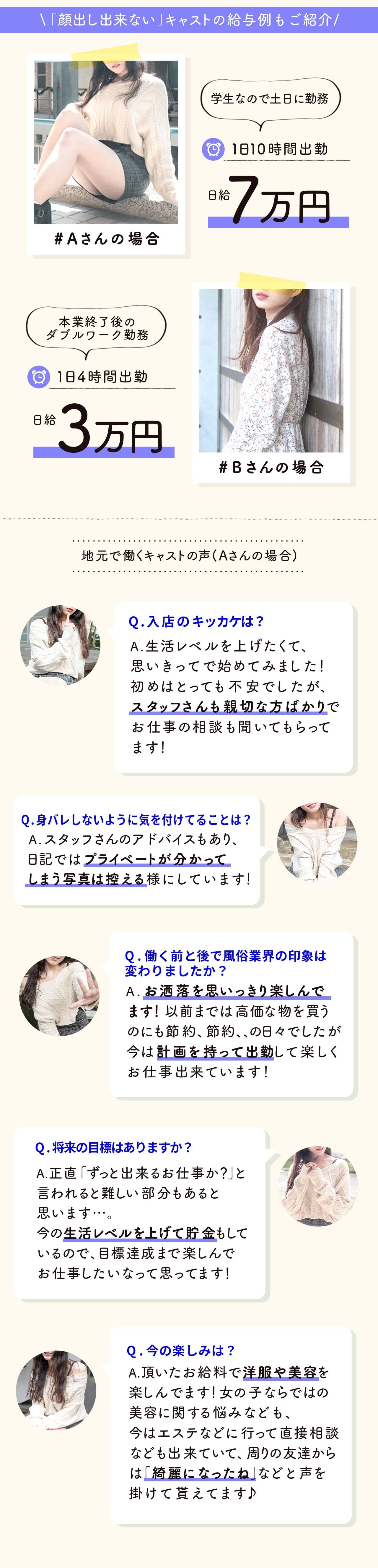 A | ポータルサイト、広告、ネットへの顔出しの強制は一切致しません!! せっかくお仕事をしているのに 身バレなどでお仕事が出来なくなったら元も子もないですよね( ゚Д゚) アリバイ対策も万全なので 安心して働いて頂く事ができます♪♪ |