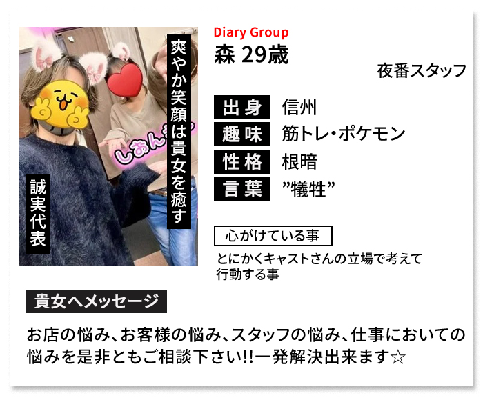 スタッフに迷惑をかける事は日常茶飯事。それでもDiaryっていうお店で働いてくれてる事、私の考えに賛同してもらって本当のキャストさんファーストを実現してくれている事に感謝しか無いですね。