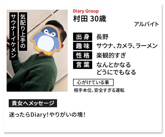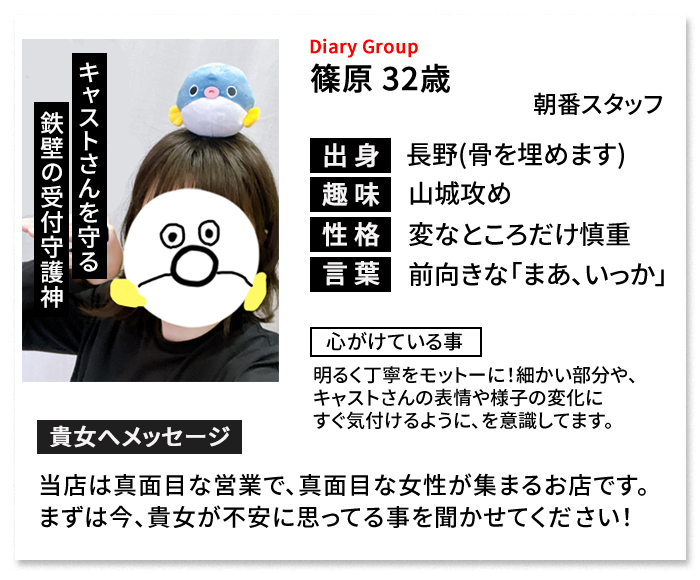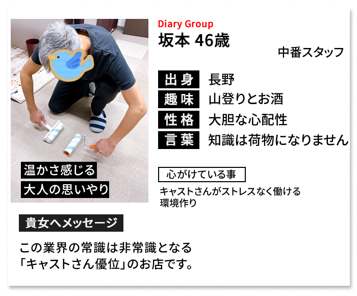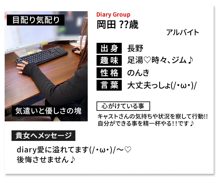 Diaryの安心は、安心できる優秀なスタッフの皆によって成り立っていますので、どうぞ皆様安心してお越し下さいませ✨