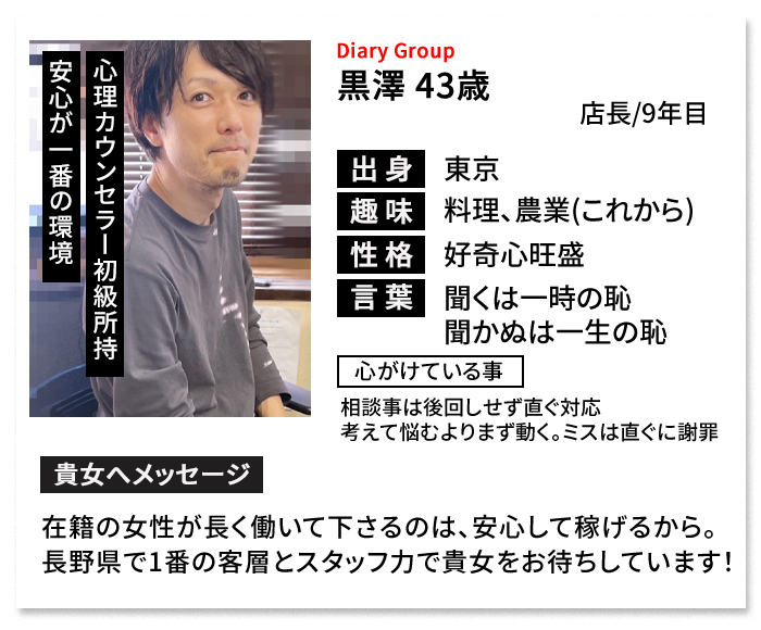 店長黒澤(43歳男性)店長になってから早10年以上経ちました。この経験を活かして、皆さんが困った時は全力でサポートさせて頂きます!とにかく動きが早い事が当店の自慢です!・盗撮撲滅運動・性病検査費用一部負担・利用規約同意書を必ず記入など、女性を守る試みを出来る事から徹底して行っています。そして女性同士でランキングを競わせるという事も行っておりません。ご自身のペースで稼いで頂く事が出来るお店となっています。1通のLINEからスタートするお金も心も豊かな人生を貴女も当店で味わってみませんか?店長Twitterはこちら↓***