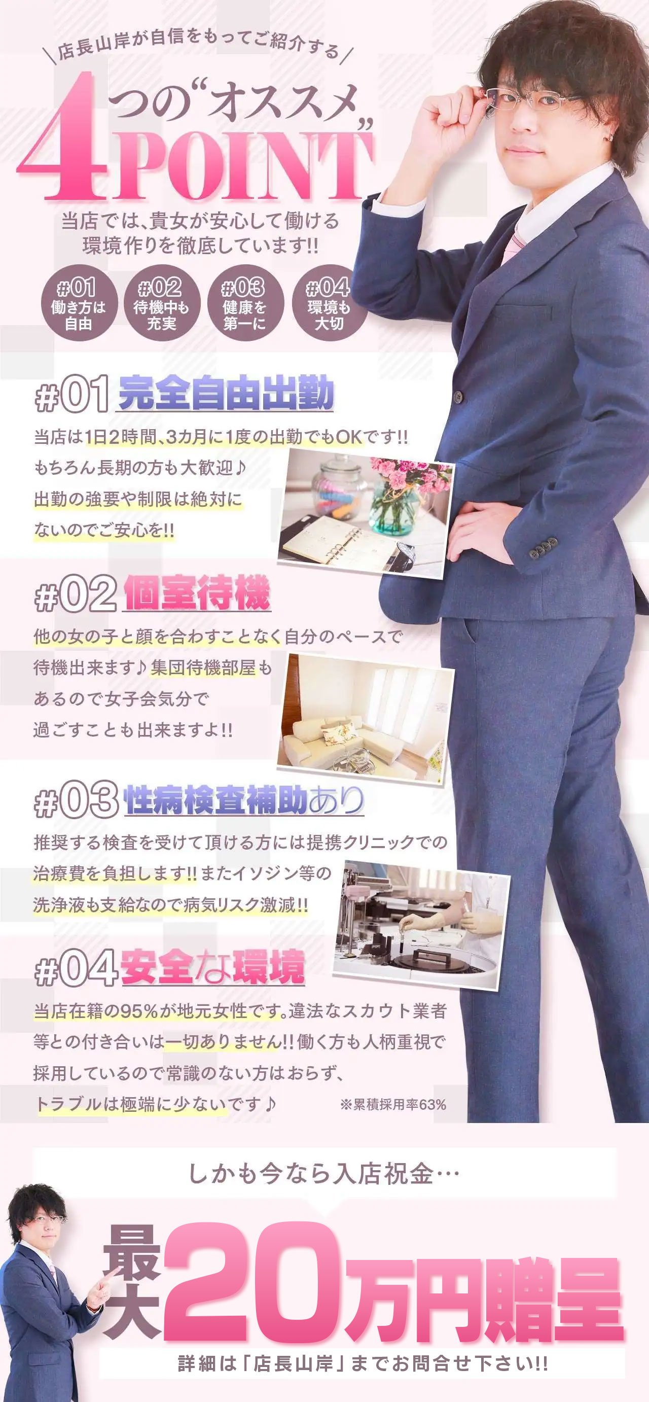 当店で働いている女性の殆どが地元の方です。県外からの出稼ぎで、何日も連日長時間出勤するような方は殆ど在籍していません。それでも1日4〜5時間で3万円前後稼いでいる方がほとんどなのは、地元だからこその丁寧さや、信用を売りにしているためだと思います。
