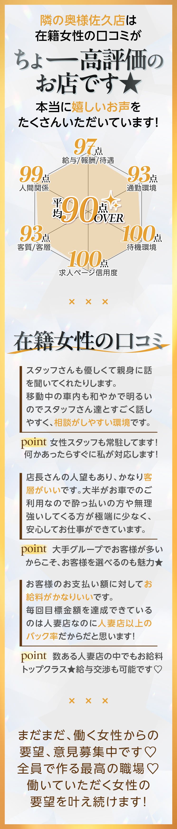 | A | 当店の採用基準は容姿やスタイルではありません!お客様に癒しをお届けするお仕事ですので、基本的な礼儀やマナー、そしてご利用頂いたお客様への感謝の気持ちを持てる方をお待ちしております!そういった気持ちが接客の際にもお客様に伝わりますので、大切なのは内面ですよ! |