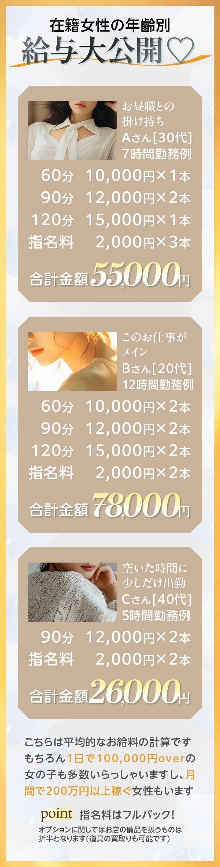 っですので、入店してすぐに日給35,000円以上稼いでいる女性がほとんどです。