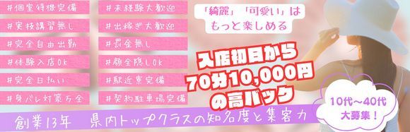 お給料が10,000円以下になることはありません。 指名料1,000円 オプション2,000円~5,000円 すべてフルバック♪ 県内でもトップクラスの高額バックをお約束! |