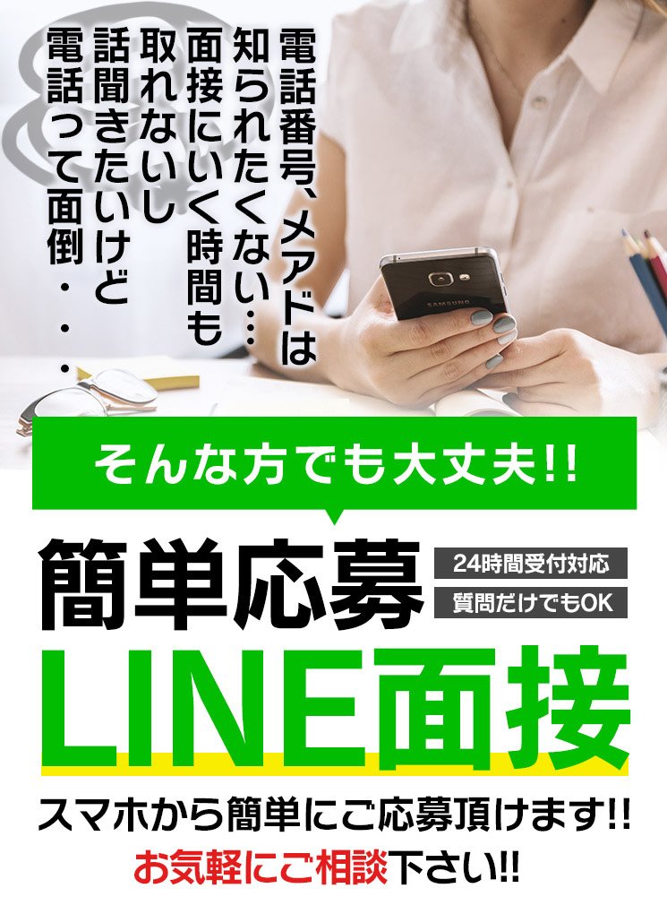 A | 面接してスグの即日入店希望の女性は別ですが、そうでなければ基本的には面接後に入店するかどうか決めてもらう為に猶予期間を1、2日ぐらいで設定させて頂きます。 この期間中に入店するかどうかを決めて頂きLINEなどでお気軽に入店の可否をお伝え頂ければと思います。 |