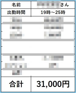※とある日の当店20代女性の19時~25時出勤での給料明細