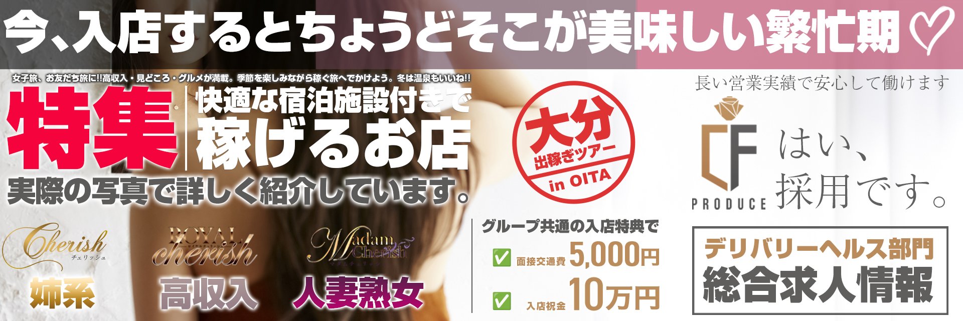 九州・大分県の老舗店【チェリッシュ】は県下最多5店舗経営のGroup店!認知度・知名度・集客力抜群!コチラの求人情報にはそのうちの3店舗をご紹介していきます。
