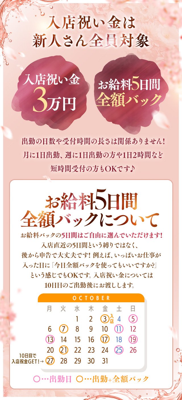 \\定着率NO.1の安定収入// 🟧5〜6時間出勤で35,000円~50,000円以上可能!! ・全額日払い制 ・割引きイベントはお店負担(女性給与の変動なし) 🟧レギュラー勤務は月給50万~100万以上稼げる! |