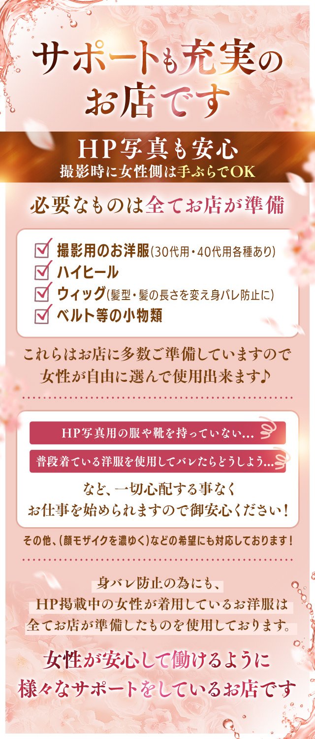 ✅当店はコンセプトが【30代40代の素人女性・人妻専門デリバリー】なので、この年代の女性たちが年齢を気にせずご活躍いただけます! やんわり清楚でおしとやかな方、お客様を癒せるような大人の女性、そんな普通の30代.40代を随時募集中! ゜+.――゜+.――゜+.――゜+.―― ゜ ✅体型崩れや妊娠線などが気になっている方へ… 当店では同じ悩みを持った女性もたくさん在籍しております。コンプレックスのある女性が人気があったりもするので、それほど心配せずにご連絡ください。頑張るあなたを応援します! ✅完全未経験の方へ… お仕事内容はごくスタンダードなヘルスプレイで、特に難しいことはありません。 「人妻店だからハードプレイ」ということもないので、未経験の方も安心してご応募ください。 ✅オプション自由! 各種オプションはコスプレやローターなどごくノーマルなものばかり。個別に「対応できる・できない」を設定していただけますので、苦手なオプションを無理に設定する必要はありません、ご安心ください。 ✅自由出勤制です シフトは自由なのでご自分のペースで働いていただけます。出勤時間も、曜日も休みもすべて自由♪ ✅ ▶昼出勤希望の方へ 事前予約も多く、出勤前にお仕事が決まっている(予約で埋まっている)日も多い人気店です! 安心してお仕事していただけます。 ✅ ▶夜出勤希望の方へ 地元客(ラブホ)+県外客(ビジネスホテル) ダブルでお客様から電話が鳴っております♪ 本業後の短時間シフトでもしっかり稼いでいる女性が多数在籍中! このお仕事のみで一気に稼ぎたい方も、副業(Wワーク)としてお小遣い稼ぎしたい方も、ぜひお気軽にご相談ください。 当店では「その人の目標金額」を常に意識し、稼げるようにサポートをさせていただきます。 ✅圧倒的顧客数と集客力! 地域トップクラスの高待遇で、しっかり稼げるお店です。 30歳~50歳くらいまでの女性を幅広く募集しておりますので、ぜひこの機会にご応募ください。 現在他店に在籍中でも面接やご説明可能です! ※質問などお気軽にお問合せください |