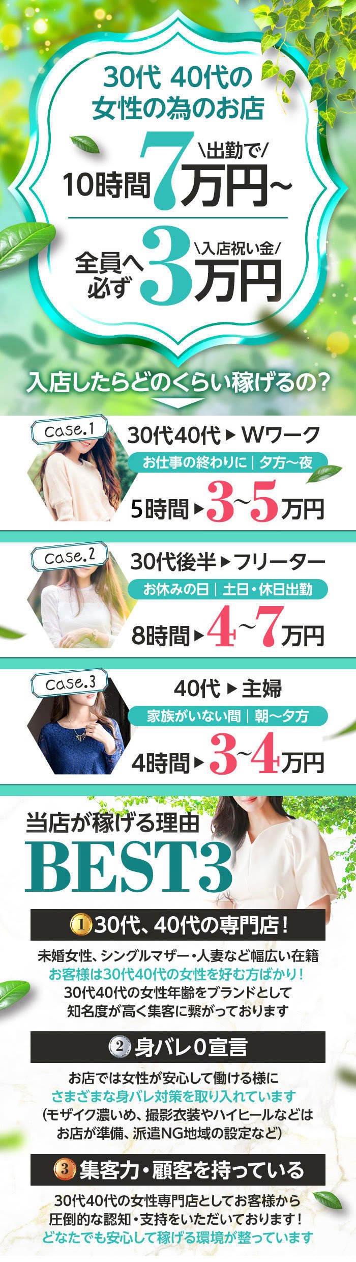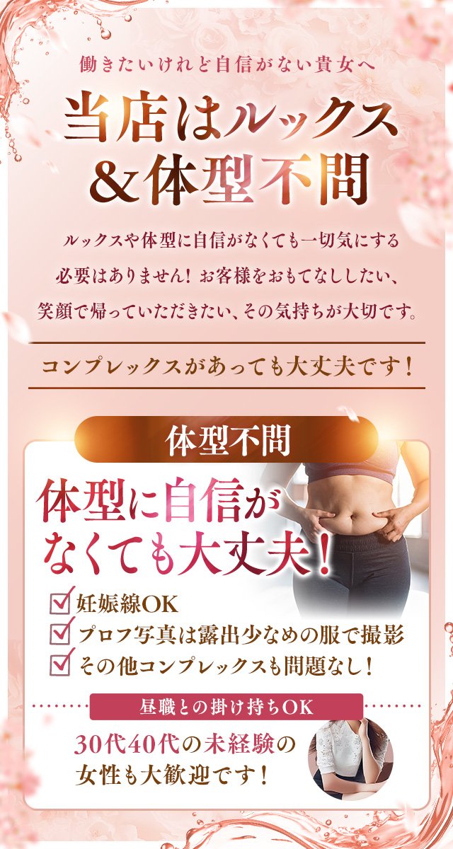 30歳~50歳くらいまでの女性を募集中! 🟧妊娠線や体型崩れは気にしない! 🟧年齢・体型・ルックスや業界経験に関係なく働いていただけます♪ ※18歳未満(高校生を含む)の応募はお断りします。 |