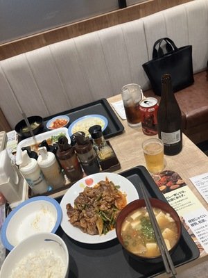 テーブルいっぱいに並んだ定食とお酒で乾杯🍺