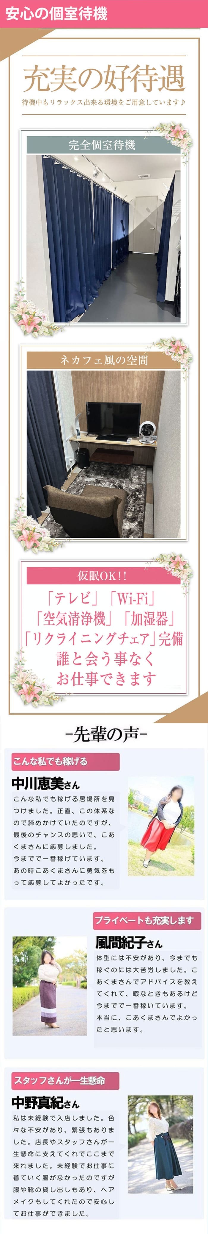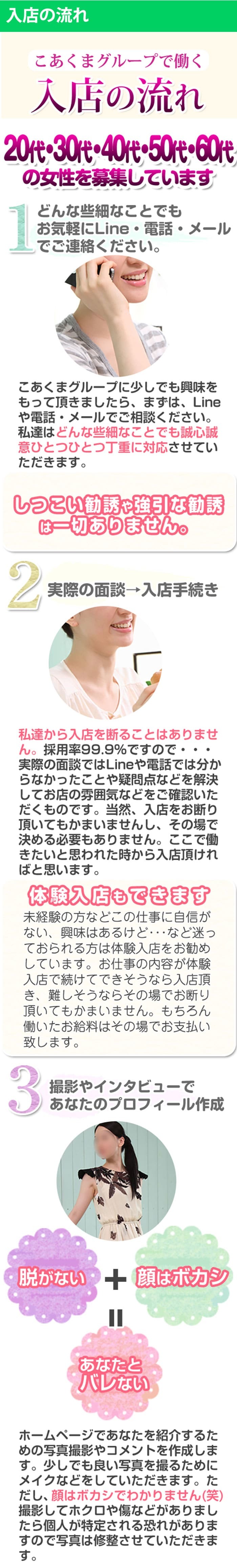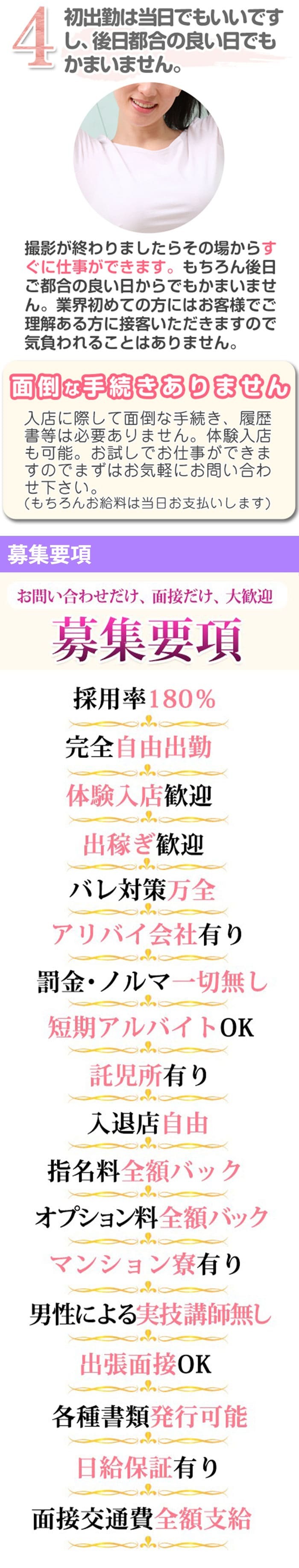 20~60代の主婦・シングルマザー・独身の方を問わず募集中。初心者・未経験の方、経験者の方も大歓迎! また他のお仕事と掛け持ち大丈夫です。 他店で断れた方も県外からお越しの方も募集しておりタトゥー(入れ墨)・傷・手術痕・妊娠線も大丈夫ですのでご安心ください! マニュアルを用意してるので未経験の方も読むだけでお仕事できます。 ※18歳未満(高校生を含む)の応募はお断りします。 |