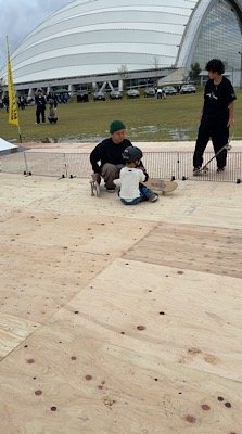目当てはマゴ太のスケボーとスケートの体験会です。