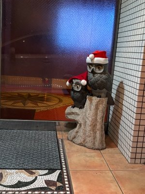 クインズコートのフクロウにサンタの帽子
