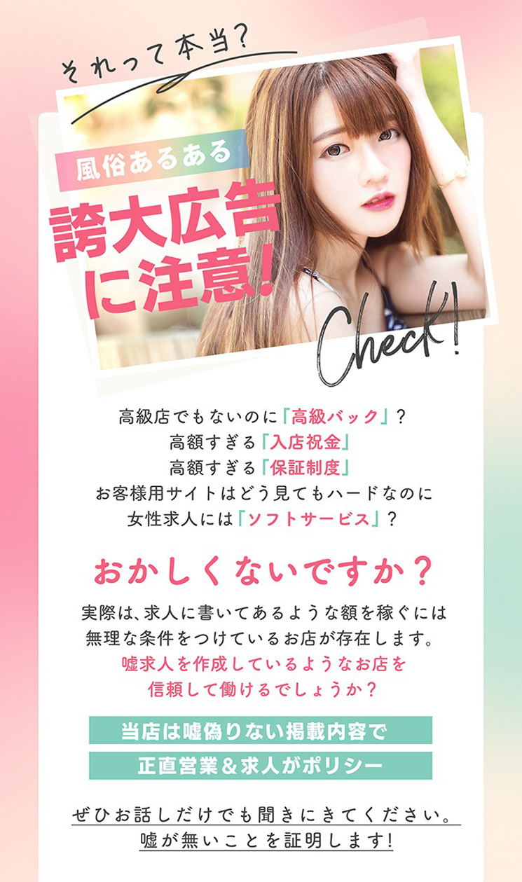 当店はとにかく「安全」が第一! 知らない場所へ行く不安は一切ナシ。 お店の中に常にスタッフがいるし、 接客前にモニターでお客さんを確認できるから、 身バレ対策もガチで徹底! 観光のお客様が多いって言っても 身バレは女の子にとって致命的。 それをキャンティでは店舗型なので回避できます。 安心してお仕事してみませんか? お問合せお待ちしております。