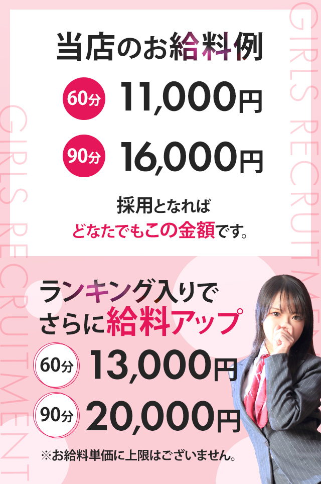 完全自由出勤、週1~OK (月に1回位の不定期出勤でも、もちろん可能)在籍女性平均給与日額 ¥34,000 (当然これ以上稼いでいる女性も多数います。)