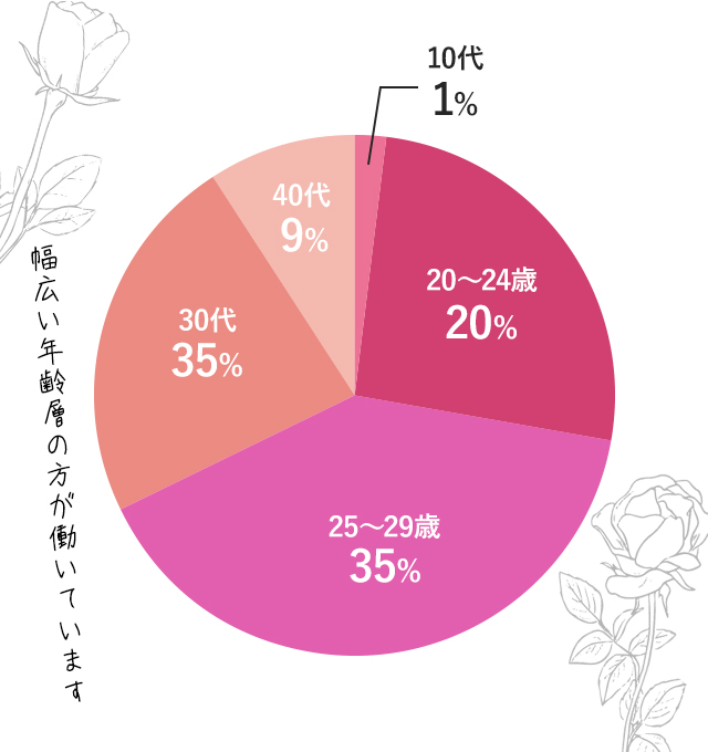 23歳位~42歳位まで(勿論、23歳以下・42歳以上の方も大歓迎です!)本当に頑張れる、働きやすい環境でお仕事したい、と考えていらっしゃる方