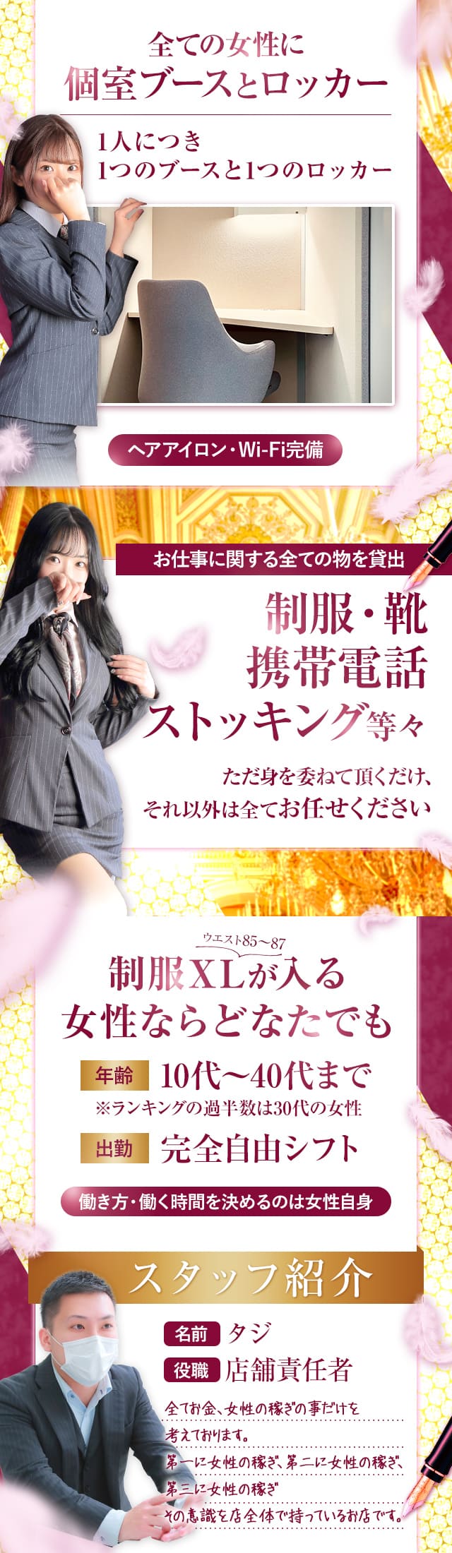 未経験女性でも【ちゃんと働けて】【ちゃんと稼げる】ようにスタッフ全員で協力体制を取っておりますので「最初の一歩」をぜひ、サポートさせて下さいませ!