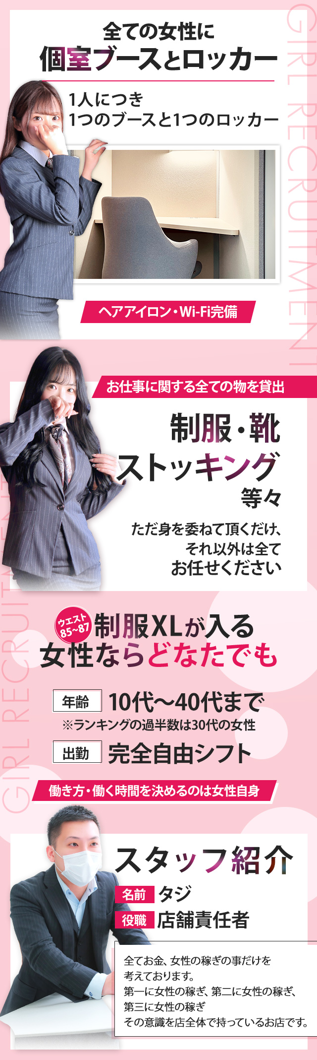 | A | スタイルというと容姿・体型などが一括りにて思い浮かばれますが、容姿や体型だけで採用を決めているわけではありません! 当店では制服(13号)が着れれば採用となります! 採用=スタイル重視ではないのでその辺りはご安心下さいませ! |
