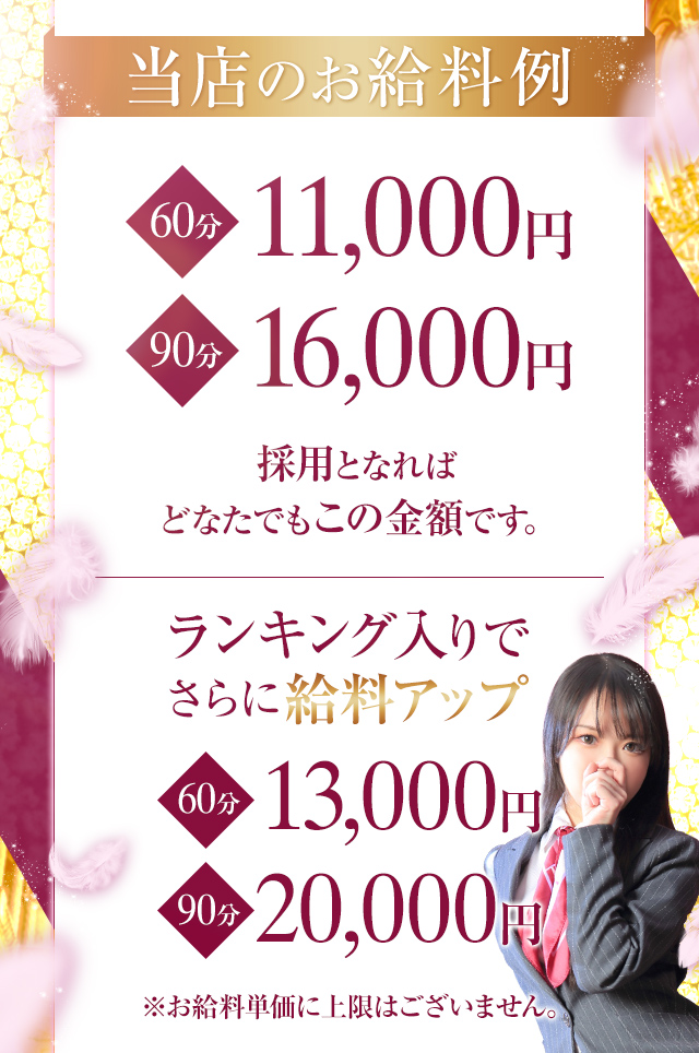 ■60分 :11000円〜15000円 ■75分 :13000円〜16000円 ■90分 :15000円〜19000円 ■120分:17000円〜22000円 ■□ オプション □■ 道具を使用する際は【50%】 道具を使用しない場合は【全て女性の給与】 (例)電マオプション【3,000円】 →道具をお店が準備するので →お店に【1,500円】 →女性に【1,500円】 (例2)即尺オプション【5,000円】 →お店は何も準備をしていない →女性に【5,000円】 ■□ 給与支払いについて □■ 報酬は完全日払いになります 当日接客し、稼いだ報酬は全額現金にてお帰りの際にお渡ししております。 -------------------------- ■□ 5日トータル保証制度 □■ 当店では、入店から述べ20日出勤されるまで 1時間×2,500円 を基本的に5日トータル保証制度を設けております。 【5日トータル保証制度とは?】 例えば5日トータル保証で 3,000円×稼働時間が付いている場合 (例) 1回目の出勤 10時~19時(9) 2回目の出勤 10時~17時(7) 3回目の出勤 10時~15時(5) 4回目の出勤 17時~26時(9) 5回目の出勤 17時~26時(9) の場合 5日間での総稼働時間が上記だと 39時間になり 39×3,000円=5日間での最低保証になります 要するに、上記の出勤時間の場合は最低でも5日間で、『117,000円』は最低稼げる事になります。 勿論、貴女の生活の状況において 出勤時間が、短くなったり、長くなったりも可能で、お好きな時間帯で出勤時間をお決めくださっても大丈夫です。 保証金額に関しては一定ではありません。 時間×2,500円というのは最低の金額となり、それ以上の金額にて保証額を決定する場合もございます。 給与シミュレーションはこちら |