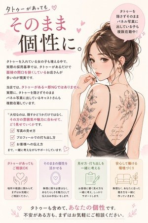 実際に、タトゥーを隠さずそのままパネル写真に出しているキャストさんも複数在籍しています。