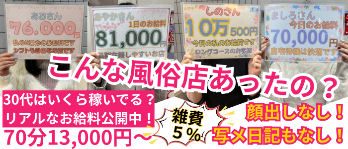 基本のコースにプラス、 オプション・指名料となり完全日払いです。 💎💎💎💎💎💎💎 【一番多い出勤例と給与】 ⏰朝9時~14時 🍀「お子さんのお迎えまで」 💰平均給与:2万~3万円 ⏰昼12時~17時 🍀「家族が家を出て帰ってくる時間まで」 💰平均給与:2万~3万円 ⏰朝10時~18時 🍀「昼職と同じ時間まで」 💰平均給与:3万~6万円 などなど、帰り時間が決まっている! そんな女性も安心してください😄 ☀️朝からお仕事のあるお店です☀️ 🌈朝に強いお店になります(^^)/ もちろんお仕事終わりの終電まで少し♪ 夜中は時間がある♪ そんな女性はもうお仕事取り放題(*'▽') 🌙夜も大大大募集中です🌃 「顔出しなし・写メ日記なし」 このリスクがなく、ここまで稼げるのはお店が広告費をかけて集客しているから👑 創業20年目になり老舗の実力は強いです🙋♀️ 移籍女性も安心してお越しくださいね😊 💎💎💎💎💎💎💎 【お給料以外にもボーナス?!】 🌹本指名料・特別指名料アリ! 「自分でお給料を決めれるシステム」 💰2,000円~10,000円 🎀全員対象・祝い金制度 「祝い金は3回あります」 ★合計平均20万円越え🎉 💴全国共通商品券がもらえる! 「毎月の指名本数によって必ず貰えます」 ★毎月なのでお給料にプラスボーナス感覚! 🎯期間限定イベント開催 「入店時にある特典でお得に入店してください」 ★まだ当店を知らない子に来るキッカケ(特典)になれば嬉しいです♪ 💎💎💎💎💎💎💎 他にも出稼ぎの子は交通費支給など♪ 「出稼ぎ情報」をみてくださいね🥳 給与シミュレーションはこちら |