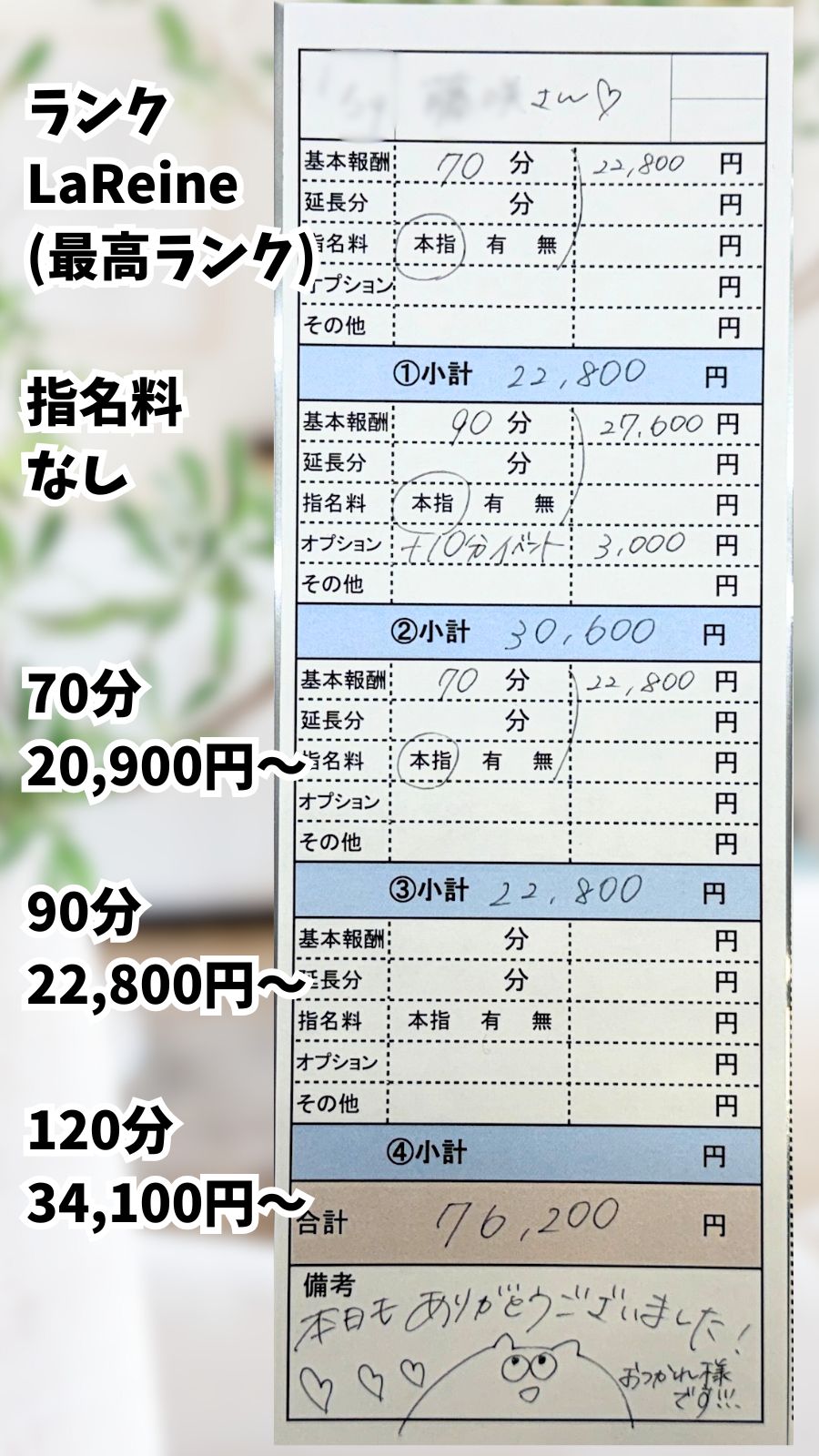 90分/本指名:+27,600円 +10分イベント:+3,000円 14:10