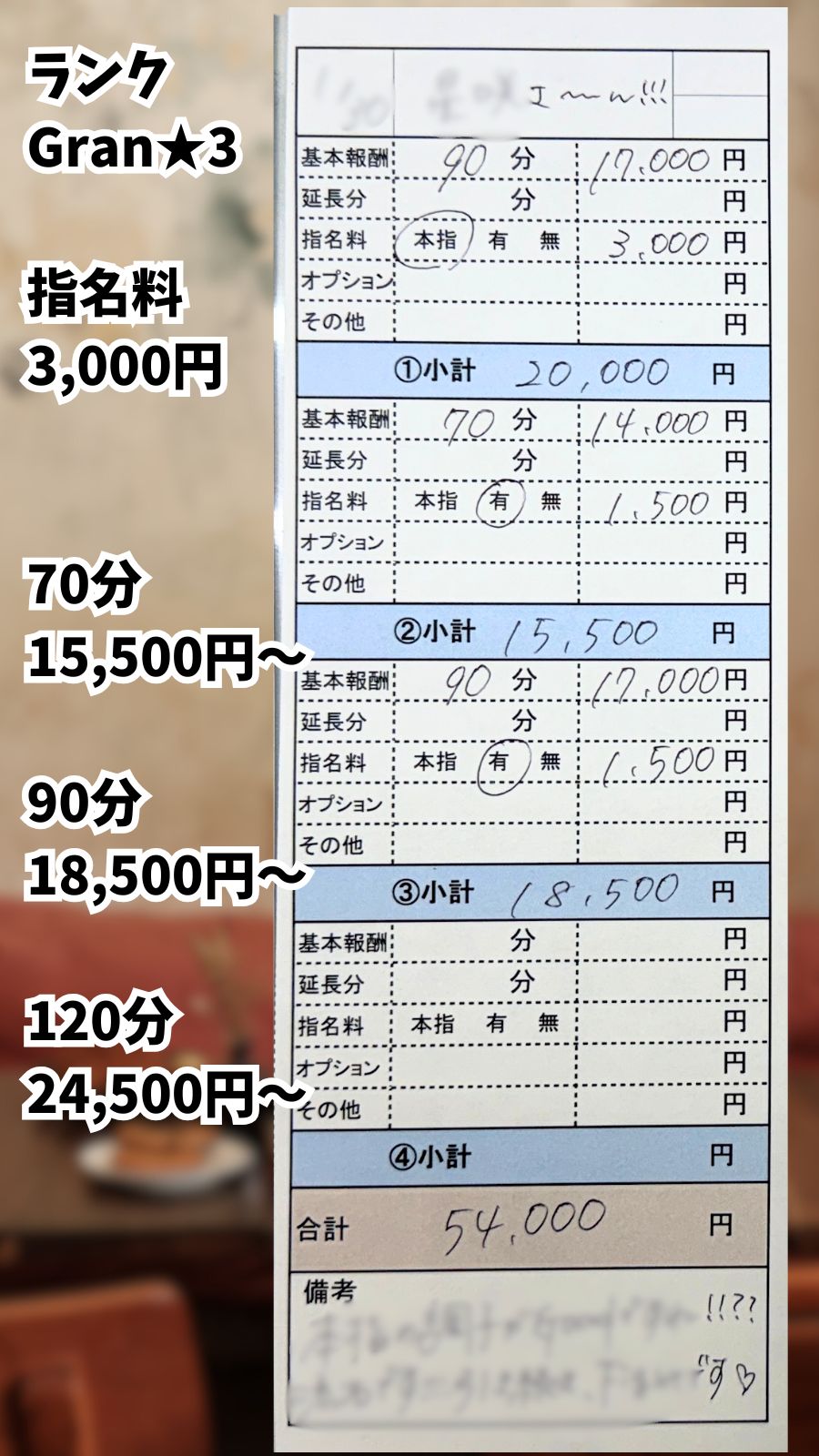 90分:+17,000円 ネット指名:+1,500円 23:00