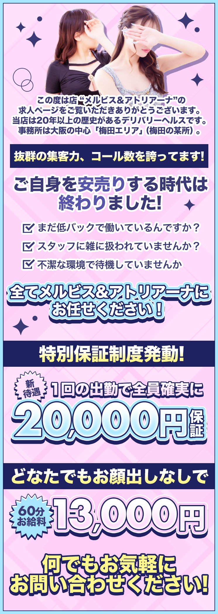 逆に、1日1人だけ、2人だけ接客でも昼職の給料が倍に!? 「新企画✨️ 1回の出勤で20,000円絶対保証🤝」 メルビス & アトリアーナ アトリアーナ → 60分最低13,000円〜💴 【各コース給与例】 60分 13,000円〜 75分 15,000円〜 90分 17,000円〜 120分 21,000円〜 150分 26,000円〜 180分 31,000円〜 本指名:プラス 1000円〜3000円 あくまで基本です! 当店は自分で自分のお給料が決めれます🤝 給料の上限はありません🙆 給与シミュレーションはこちら |