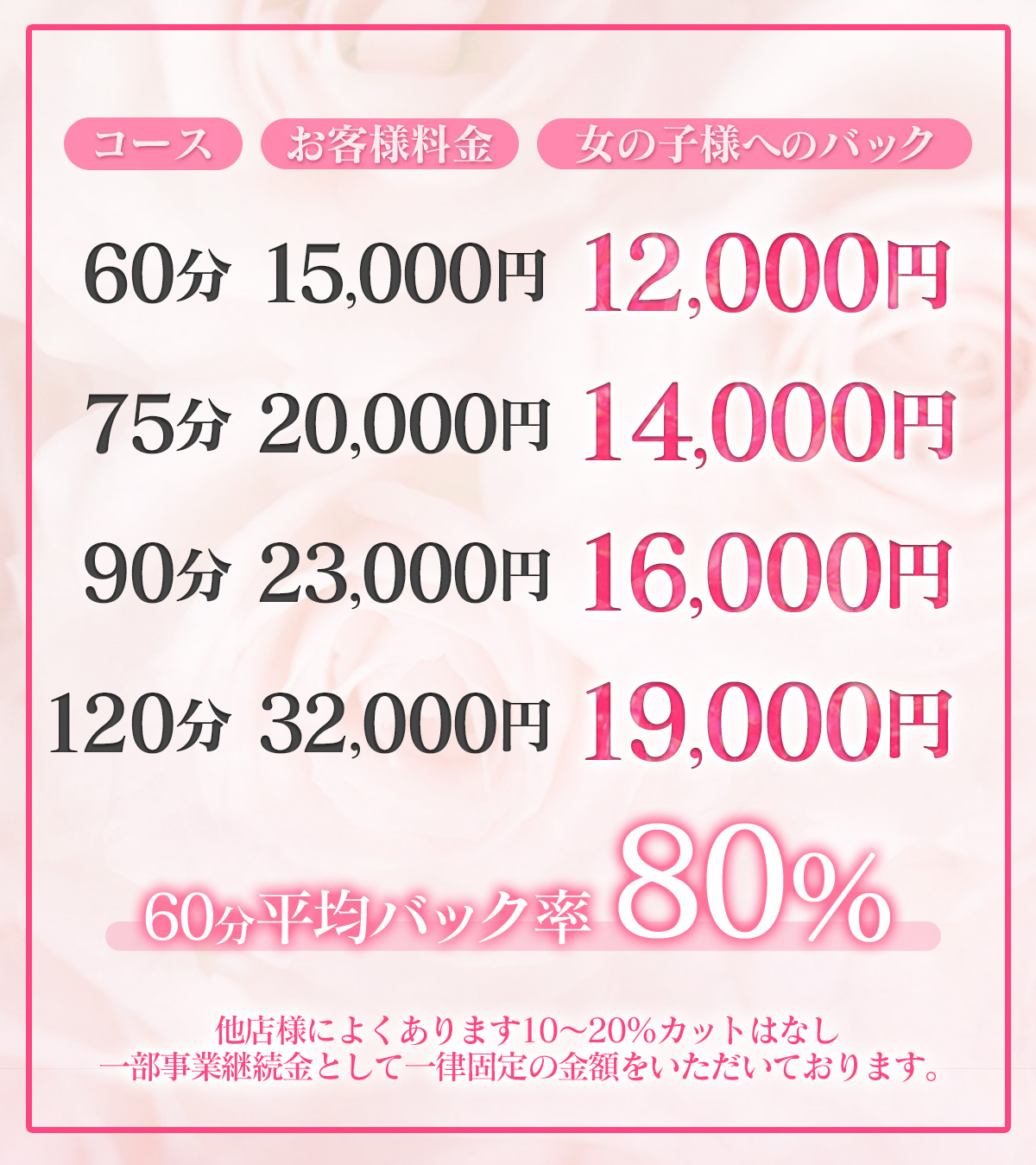Pink Collectionでは在籍女性に最低限の報酬を得られるよう保証制度もご用意しております。