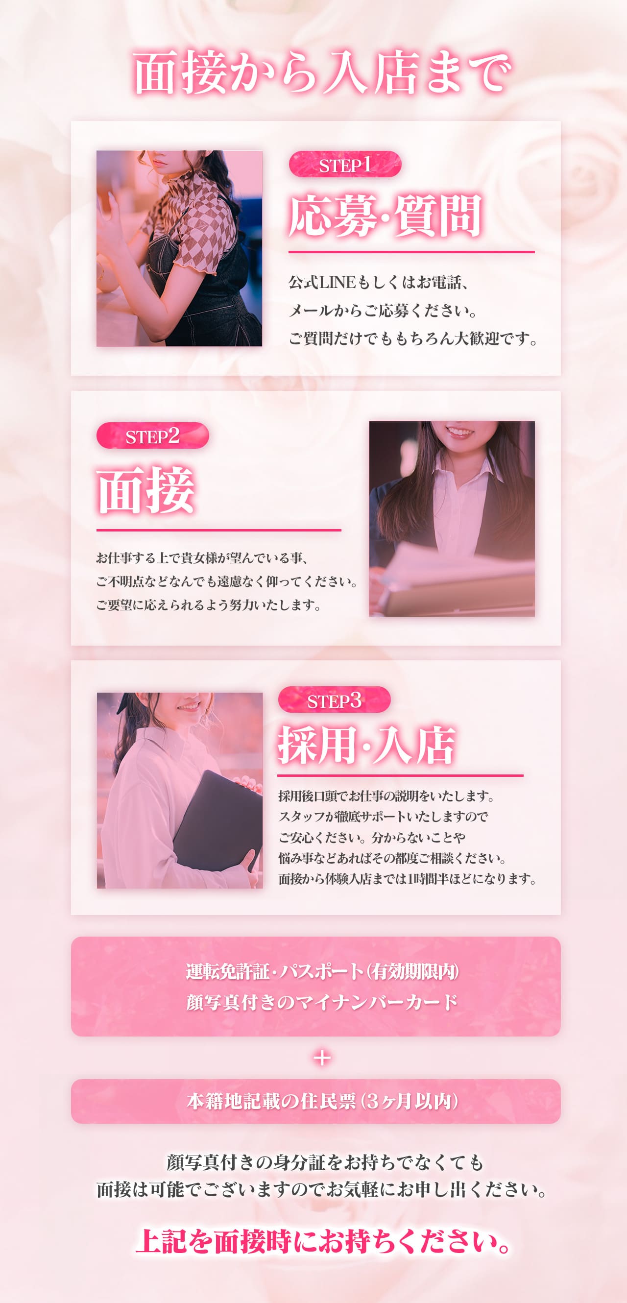 | A | 面接にお越しいただく場合は、 「顔写真付き身分証」+「本籍地入りの住民票」が必要となります! パスポートをお持ちであればその1点だけで大丈夫ですがそれ以外の場合は 一度、お気軽にご相談下さいませm(_ _)m |