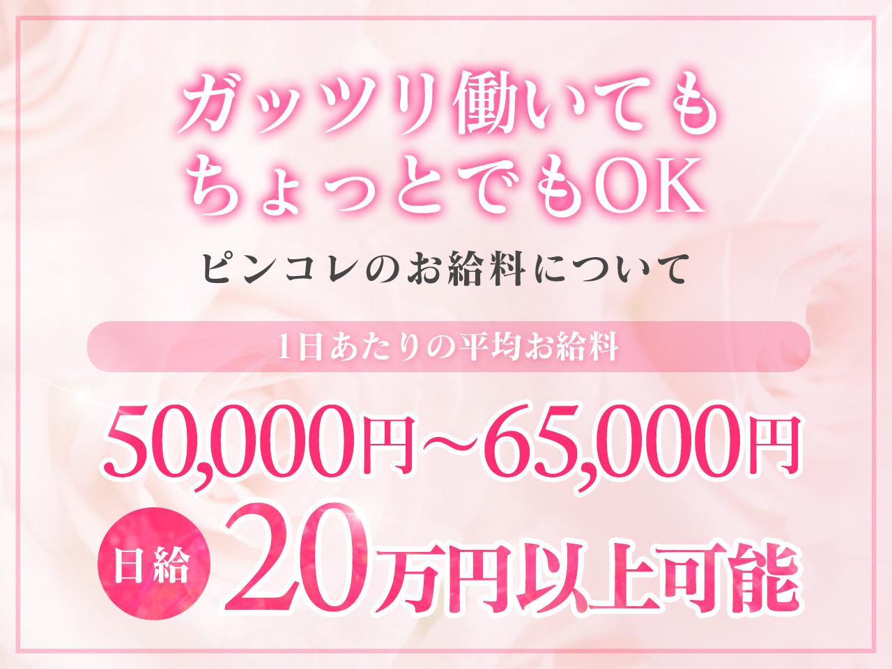 入店初日から待機なくお仕事が入り、あっという間に完売になりました!2日目から本指名様が会いに来てくれたので本当に嬉しかったです♡出勤日は、完売になることが多いので安定した稼ぎを得られます。ピンコレは有名店なので、ご新規様のお客様も多いし稼ぎたい!っていう女の子はピンコレおすすめです