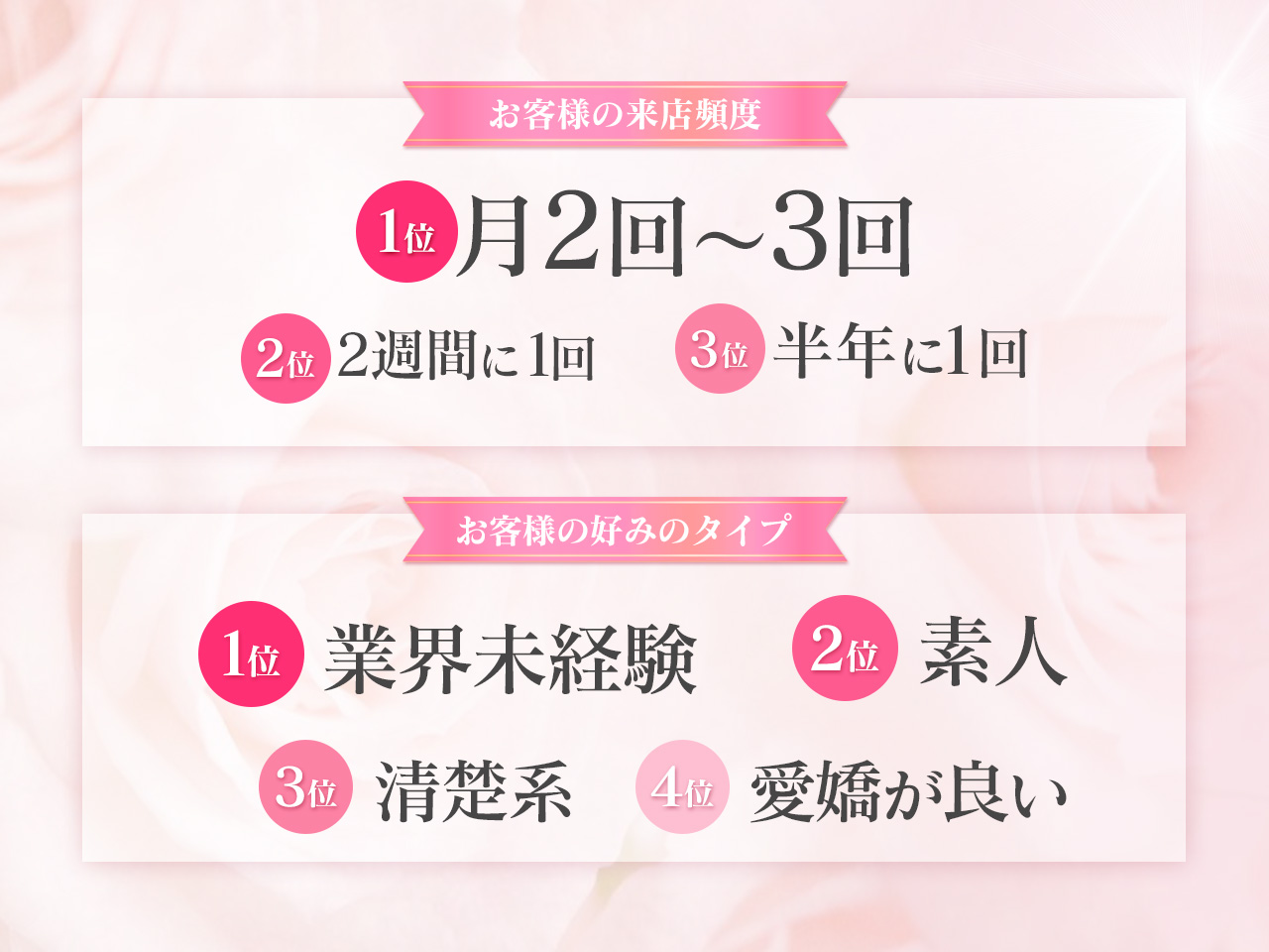 18歳~30歳位まで(高校生不可)・未経験者歓迎!・大学生、OL、主婦の方歓迎!・経験者(他店ランカー様)優遇有ります☆
