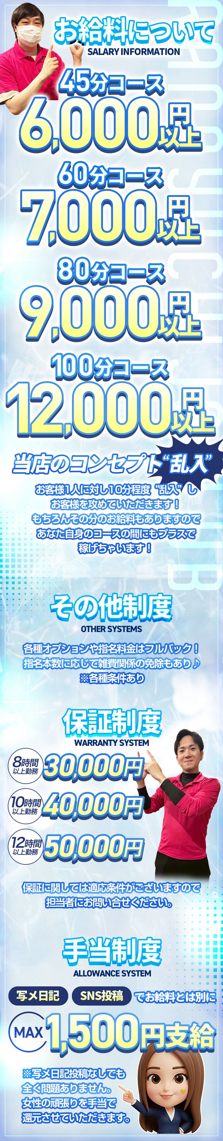 | A | お給料は完全日払い制になります。 【バック金額】 60分コース: 7,000~14,000円~更にプラス 80分コース: 8,000~17,000円~更にプラス 100分コース: 11,000~20,000円~更にプラス 【その他待遇】 ◆延長20分: 2500~3500円 ◆オプション フルバック ◆衣装: お店に貸出ありますのでご安心ください♪ |