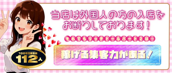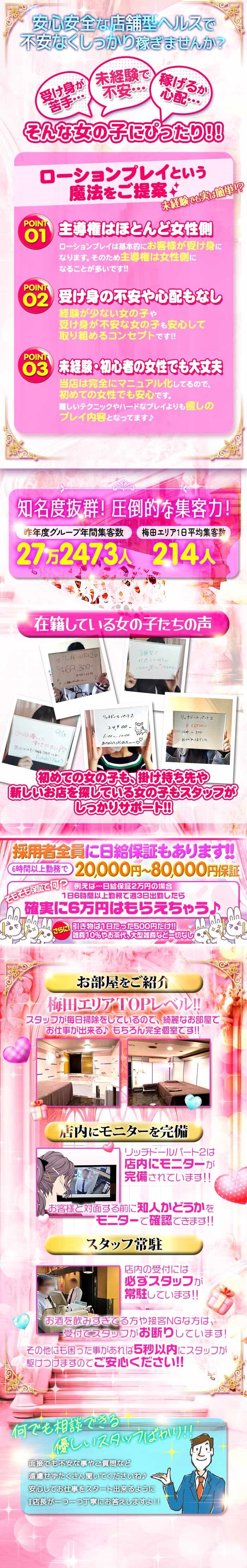 ~リッチドールパートⅡの魅力~ 大阪で数少ない箱ヘル(店舗型ヘルス)の約半数を運営している「リッチドールグループ」の中でも最大数の会員様に応援して頂いている超人気店です(^^) 梅田には数店舗しか箱ヘル(店舗型ヘルス)がなく、その中でもお客様からの信頼も厚く集客力は抜群です!! ◇◇時間効率が圧倒的◇◇ 徒歩で移動や車で移動する時間はお金を生まない無駄な時間となっちゃいます。 少ない時間の勤務ならお仕事につける数が少なくなっちゃいます。 長時間勤務でたくさんお仕事につく場合には、ロスが積み重なってとんでもなく無駄な時間が増えていきます。 1日ならまだしも...1ヶ月、3ヶ月、半年、一年と 無駄な時間は膨大に膨れ上がっていくばかりなのです。 リッチドールパート2梅田は、すべて店舗内でのお仕事になりますので移動時間は“0”です。 少ない時間でも時間効率よくお仕事につくことができます(^^) 長時間勤務なら...先ほどの説明の逆になります(^^) つまり、短時間でも長時間でも移動時間という無駄な時間はない方が良い! という事になります(^^) ◇◇こんな良いところも◇◇ 衣装の無料貸し出しをしています(^^) 私服でのお仕事ではありませんので、毎日の洋服に悩むこともお金がかかることもありませーん! 1日の引き物が500円です♪(*′∀`)b゛ スゴ☆スギ★ 5万円稼いで10%引きなら5,000円も引かれちゃいます(´ε`*)いやだよぉ~ん♪. リッチドールパート2梅田なら500円だけ♪ 面接交通費がもらえちゃう♡ 合否に関わらず面接にお越し頂けた方全員に1,000円支給します(^^) ~☆~☆~☆~☆~☆~☆~☆~☆~☆~ スタッフも元気で明るいスタッフばかりで怖い人は一切居ません!! お客様と接する機会も多く接客レベルの高いスタッフばかりなので 女の子が不快に思うようなスタッフは1人もいませんよ☆ お給料の事やその他の待遇など、ご質問だけでも構いませんので 気になった方は是非一度お問合せくださいね♪ |