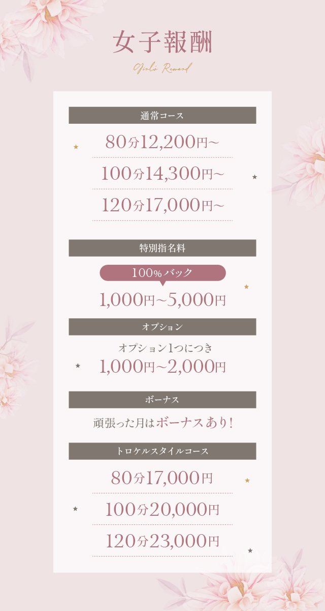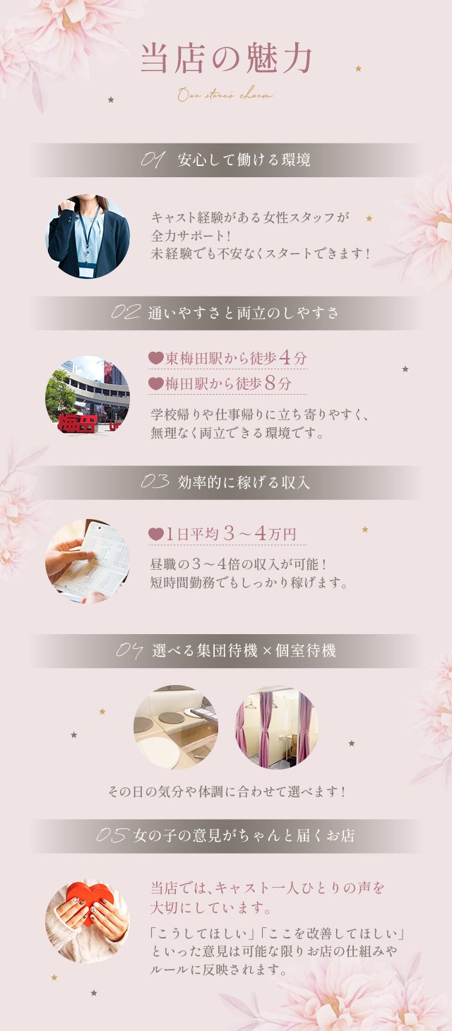 10万や20万などインパクトのあるド派手なイメージはないとは思いますが、嘘もないので働きやすく安心して頂けると思います。未経験で不安な方も、経験者で疲れてしまった方も、一度お話だけでも聞きにいらしてください^^