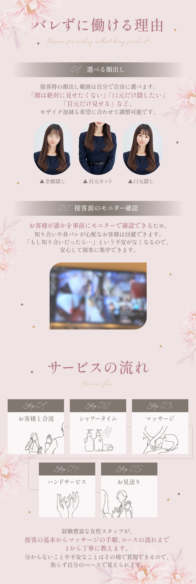 | A | 自分から言わない限りはバレません! バレ対策も教えますので、ご安心ください! もちろん、顔出しなしでも働けます。 |