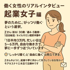 Zさんのように、起業や夢に向かって努力している女性が、今アネステ十三本店で活躍中です。