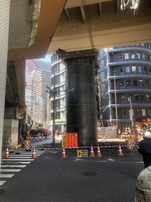 出勤前に現場を見にいってみたのですが、たしかに(上を通っている)高架道路の支柱にしか見えないくらい突き出ていました🥶